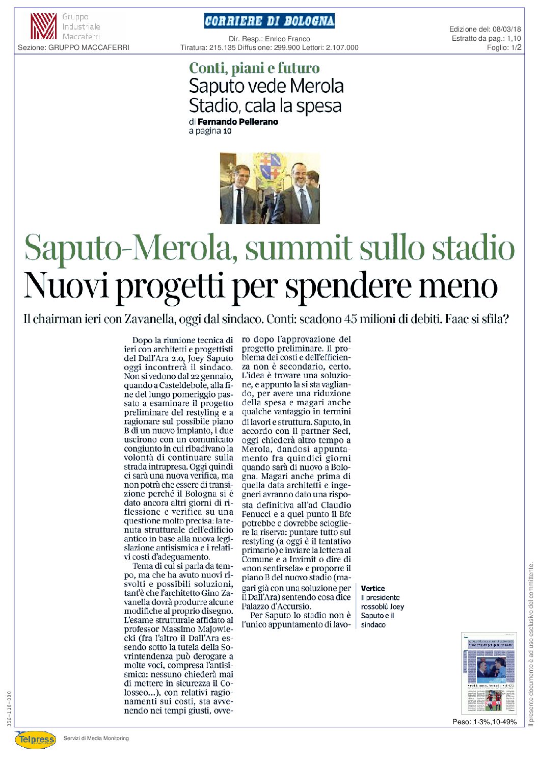 Tema di cui si parla da tempo, ma che ha avuto nuovi risvolti e possibili soluzioni, tant’è che l’architetto Gino Zavanella dovrà produrre alcune modifiche al proprio disegno. L’esame strutturale affidato al professor Massimo Majowiecki (fra l’altro il Dall’Ara essendo sotto la tutela della Sovrintendenza può derogare a molte voci, compresa l’antisismica: nessuno chiederà mai di mettere in sicurezza il Colosseo…), con relativi ragionamenti sui costi, sta avvenendo nei tempi giusti, ovvero dopo l’approvazione del progetto preliminare. Il problema dei costi e dell’efficienza non è secondario, certo. L’idea è trovare una soluzione, e appunto la si sta vagliando, per avere una riduzione della spesa e magari anche qualche vantaggio in termini di lavori e struttura. Saputo, in accordo con il partner Seci, oggi chiederà altro tempo a Merola, dandosi appuntamento fra quindici giorni quando sarà di nuovo a Bologna. Magari anche prima di quella data architetti e ingegneri avranno dato una risposta definitiva all’ad Claudio Fenucci e a quel punto il Bfc potrebbe e dovrebbe sciogliere la riserva: puntare tutto sul restyling (a oggi è il tentativo primario) e inviare la lettera al Comune e a Invimit o dire di «non sentirsela» e proporre il piano B del nuovo stadio (magari già con una soluzione per il Dall’Ara) sentendo cosa dice Palazzo d’Accursio.